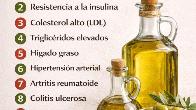 Esto no significa que el aceite de oliva sustituya el tratamiento médico, pero puede ser un valioso suplemento gracias a sus propiedades antiinflamatorias, antioxidantes y reguladoras del metabolismo.